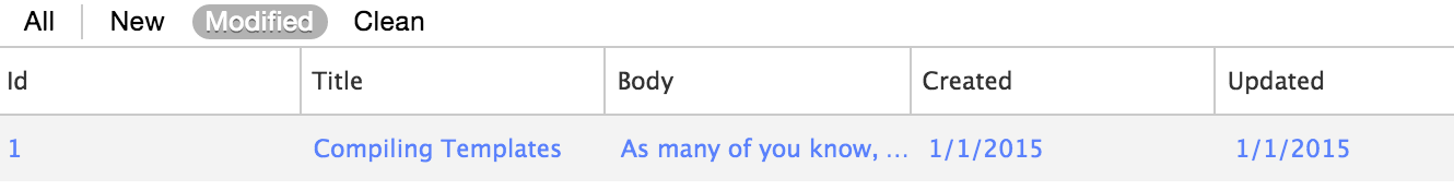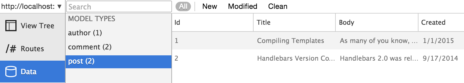 You can inspect your models by clicking on the Data tab. Check out Building a Data Custom Adapter below if you maintain your own persistence library. When you open the Data tab, you will see a list of model types defined in your application, along with the number of loaded records. The Inspector displays the loaded records when you click on a model type.
