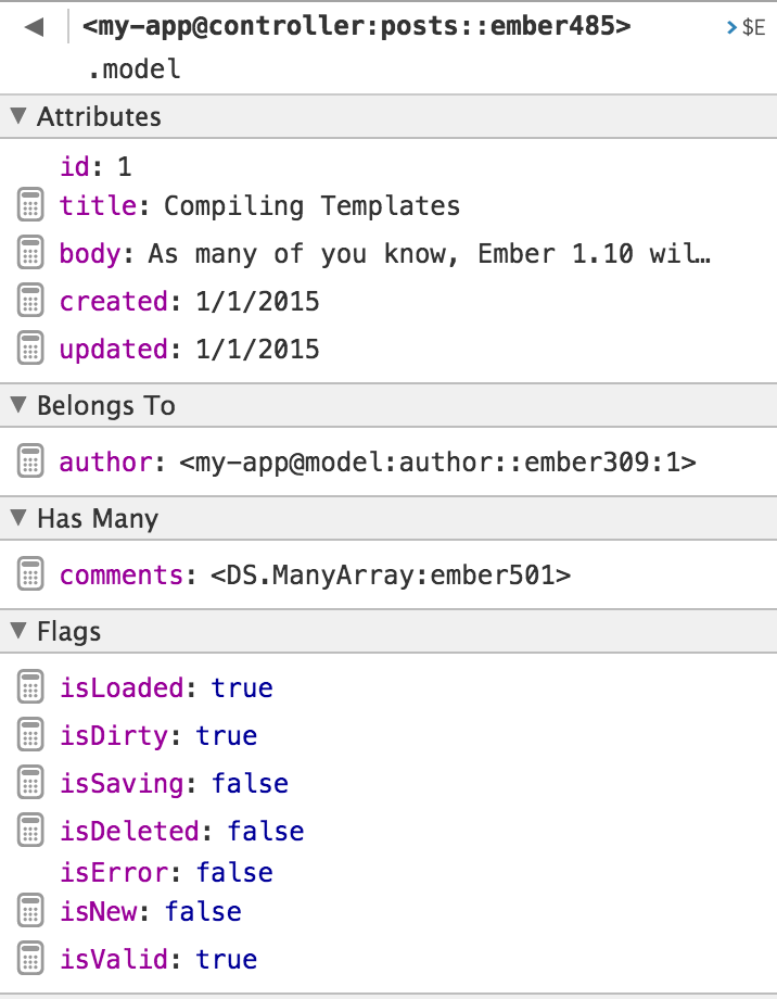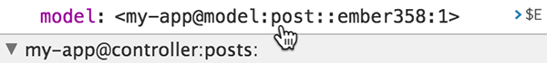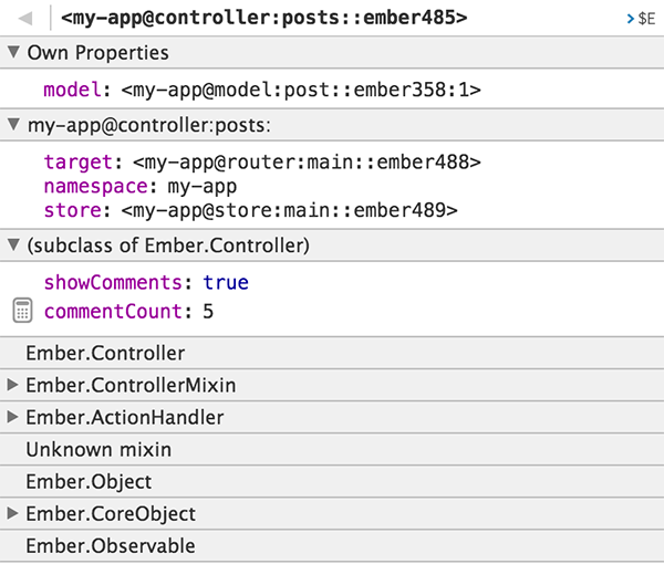 In addition to inspecting the properties above, you can inspect properties that hold Ember objects or arrays. Click on the property's value to inspect it.
