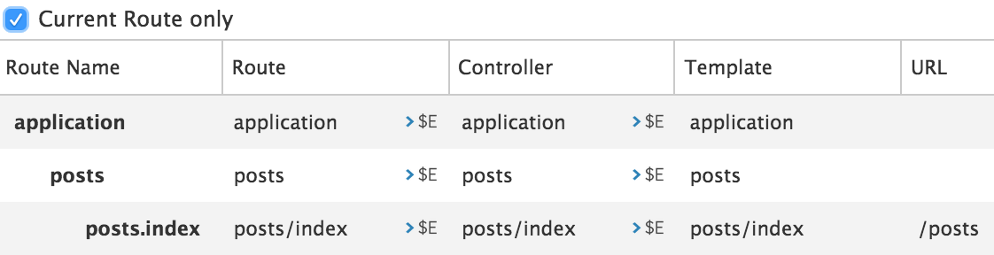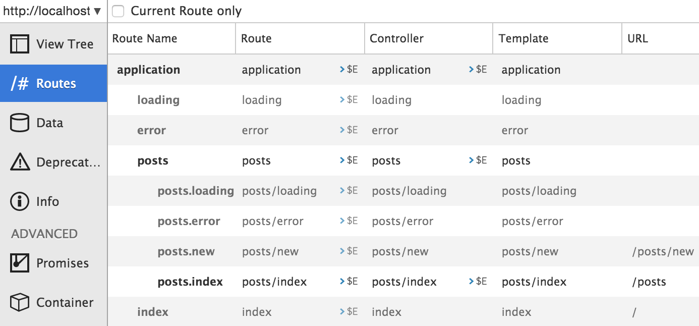 As you can see, the Inspector shows the routes you defined as well as the routes automatically generated by Ember.